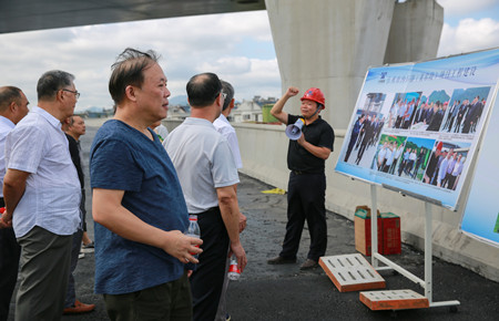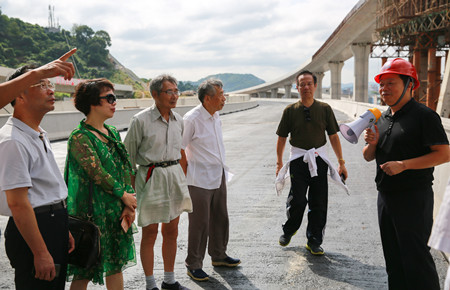圖為在6#立交上了解工程建設(shè)情況 老干部一行實地踏勘了內(nèi)環(huán)路(黃巖段)各施工現(xiàn)場,全面了解了四個標(biāo)段工程當(dāng)前建設(shè)情況。一路上,老干部們一面聽取各標(biāo)段工作匯報,一面用手機相機記錄現(xiàn)場當(dāng)前建設(shè)情況,當(dāng)知道今年11月11日內(nèi)環(huán)路將實現(xiàn)主線通車時,老干部們紛紛豎起大拇指,為內(nèi)環(huán)路建設(shè)的進度和質(zhì)量點贊,同時表示將多走多看,為內(nèi)環(huán)建設(shè)盡自己的一份力。 鐘彪對老干部們的關(guān)心和支持表示衷心感謝,并希望各位老干部多指導(dǎo)、多監(jiān)督、多提寶貴意見,助力臺州城市建設(shè)趕超發(fā)展。 張琛